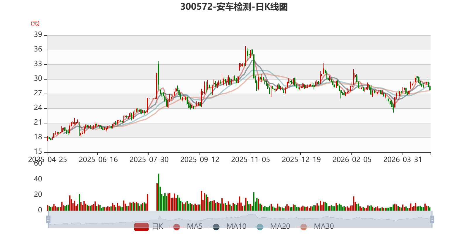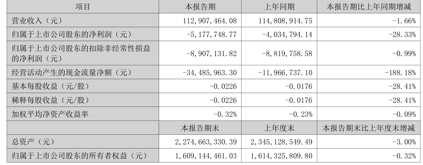 中证智能财讯安车检测(300572)4月25日披露2026年第一季度报告。公司实现营业总收入1.13亿元,同比下降1.66%;归母净利润亏损517.77万元,上年同期亏损403.48万元;扣非净利润亏损890.71万元,上年同期亏损881.98万元;经营活动产生的现金流量净额为-3448.6万元,上年同期为-1196.67万元;报告期内,安车检测基本每股收益为-0.0226元,加权平均净资产收益率为-0.32%。