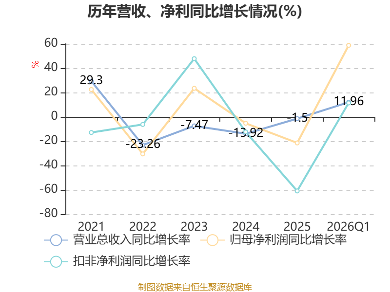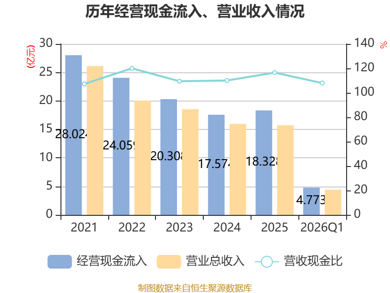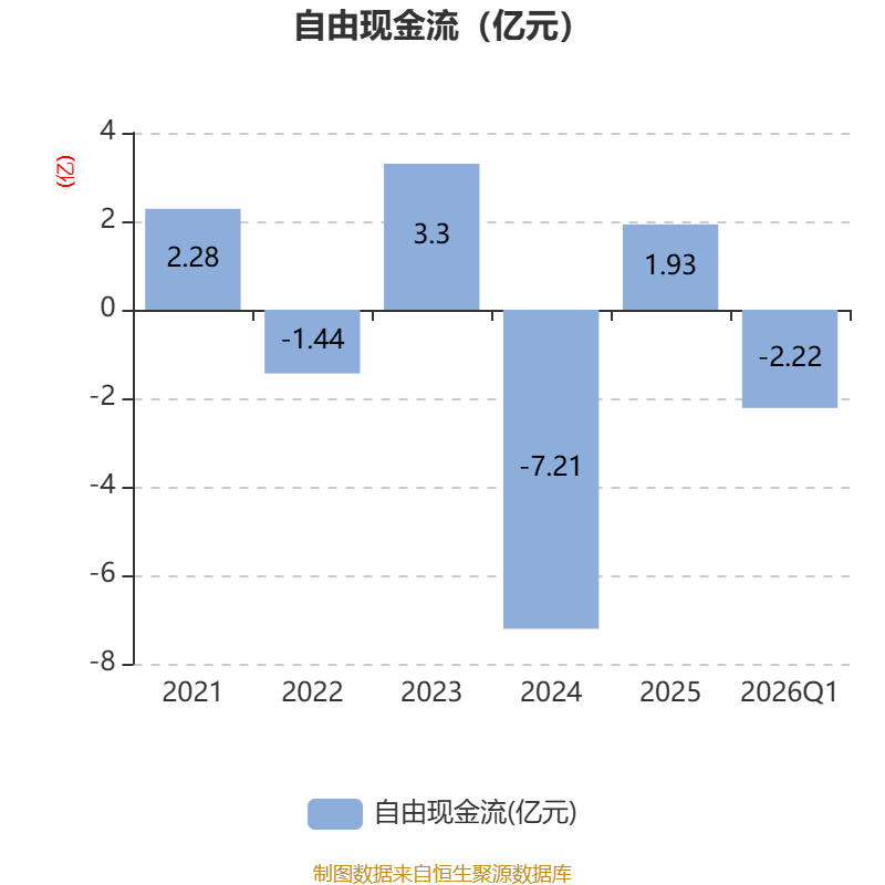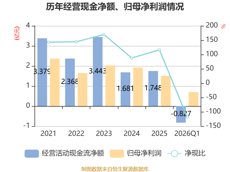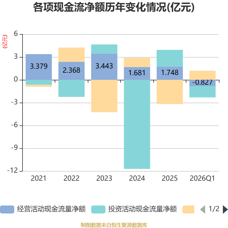 截至2026年一季度末,公司经营活动现金流净额为-8269.85万元,同比减少4822.11万元;筹资活动现金流净额1.19亿元,同比增加4.33亿元;投资活动现金流净额-1.49亿元,上年同期为4.53亿元。