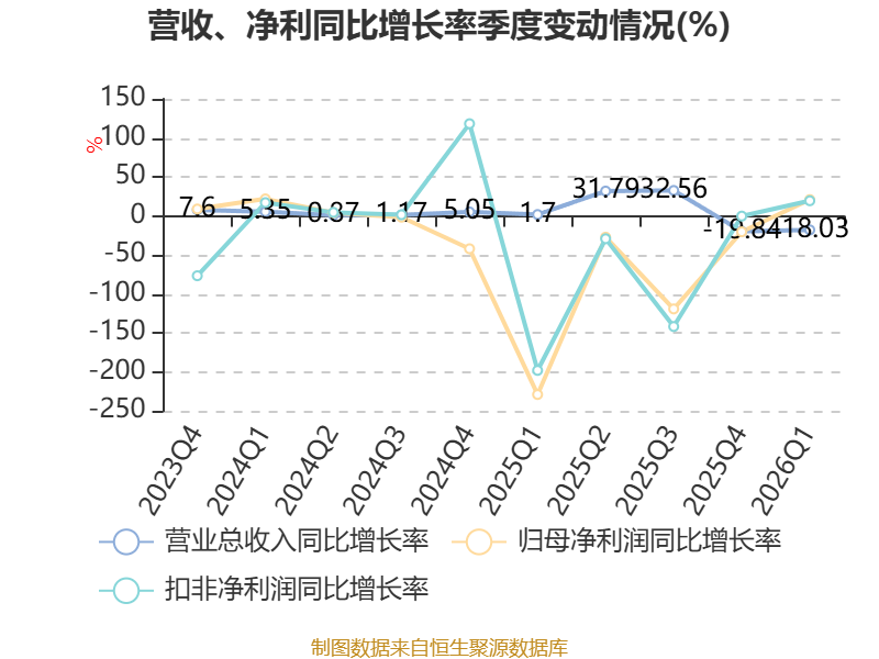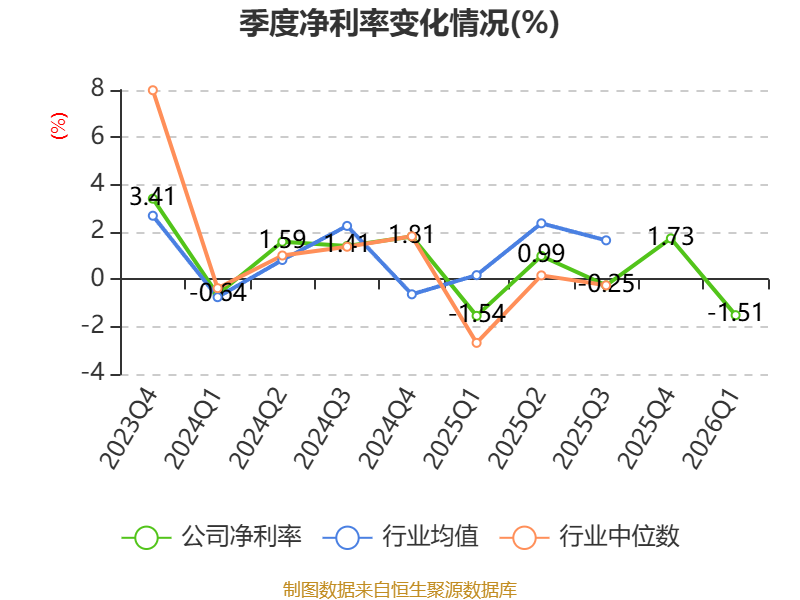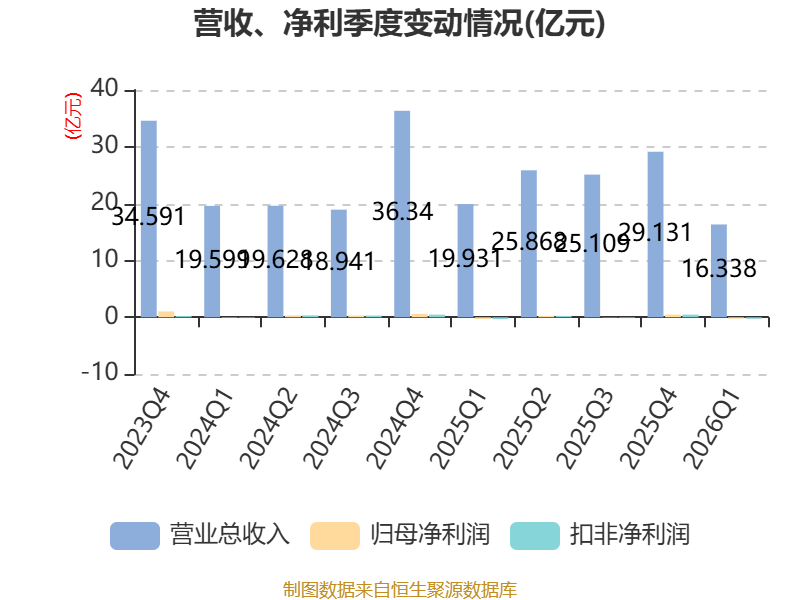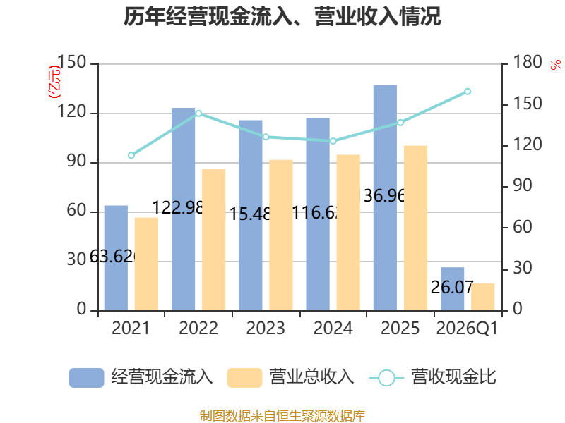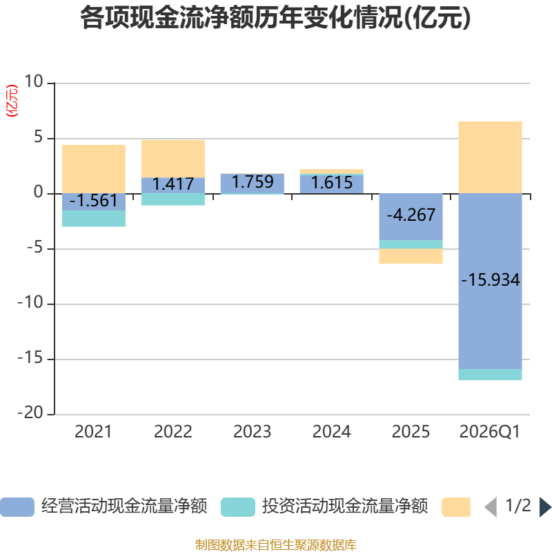 截至2026年一季度末,公司经营活动现金流净额为-15.93亿元,同比增加2.38亿元;筹资活动现金流净额6.51亿元,同比增加4.41亿元;投资活动现金流净额-1.01亿元,上年同期为-1.25亿元。