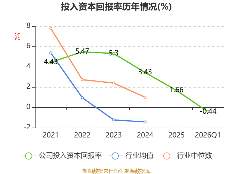 盈利能力方面, 2026年一季度公司加权平均净资产收益率为-0.88%,同比上升0.24个百分点。公司2026年第一季度投入资本回报率为-0.44%,较上年同期上升0.08个百分点。