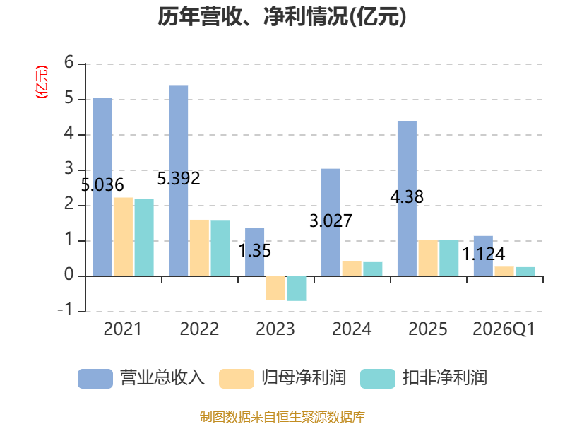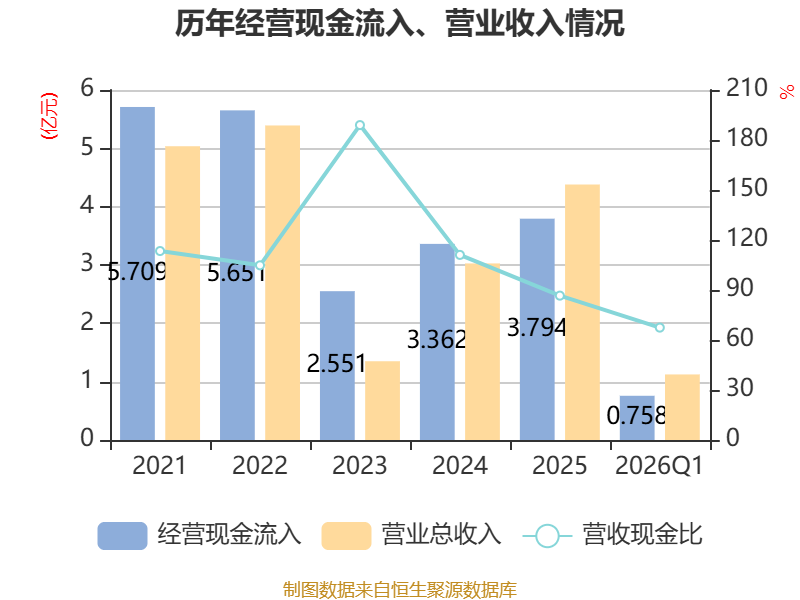 截至2026年一季度末,公司经营活动现金流净额为2522.58万元,同比下降44.87%;筹资活动现金流净额-238.06万元,同比减少220.06万元;投资活动现金流净额4211.04万元,上年同期为-2246.69万元。