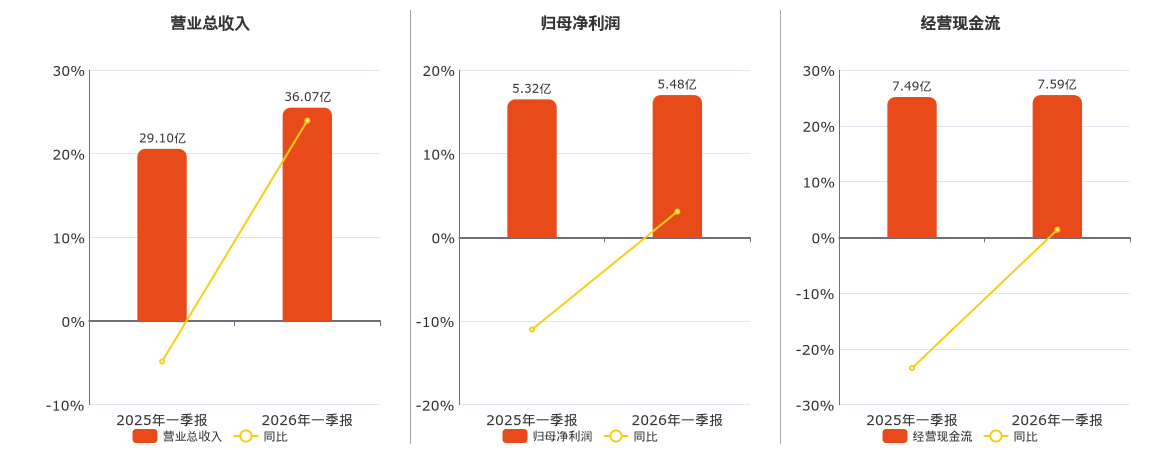 公司营业总收入为36.07亿元,较去年同报告期营业总收入增加6.97亿元,同比较去年同期上涨23.96%。归母净利润为5.48亿元,较去年同报告期归母净利润增加1637.35万元,同比较去年同期上涨3.08%。经营活动现金净流入为7.59亿元,较去年同报告期经营活动现金净流入增加1015.11万元,同比较去年同期上涨1.36%。