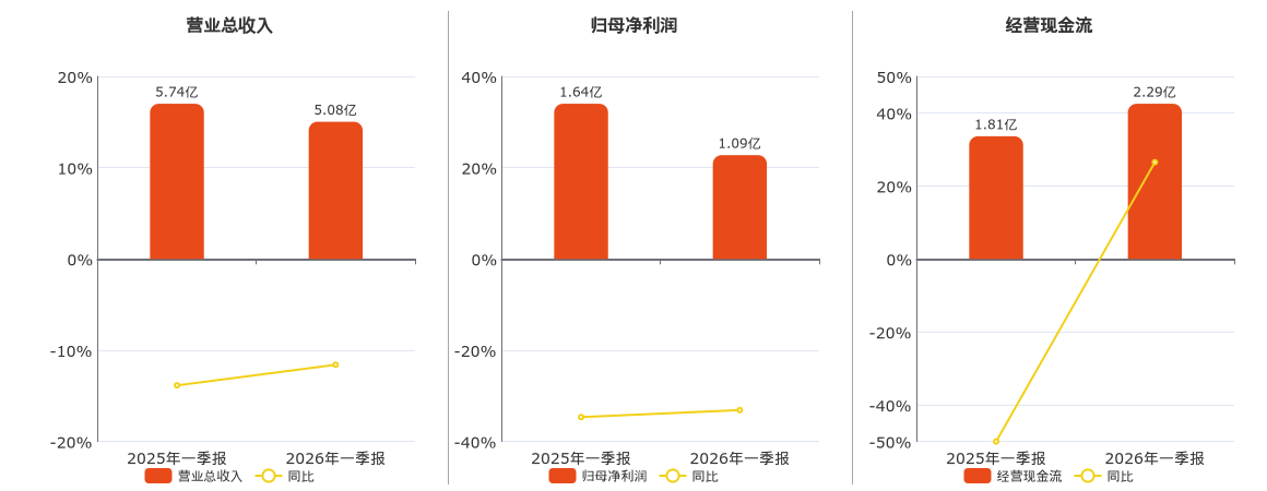 公司营业总收入为5.08亿元,较去年同报告期营业总收入减少6654.91万元,同比较去年同期下降11.59%。归母净利润为1.09亿元,较去年同报告期归母净利润减少5419.66万元,同比较去年同期下降33.11%。经营活动现金净流入为2.29亿元,较去年同报告期经营活动现金净流入增加4806.61万元,同比较去年同期上涨26.50%。