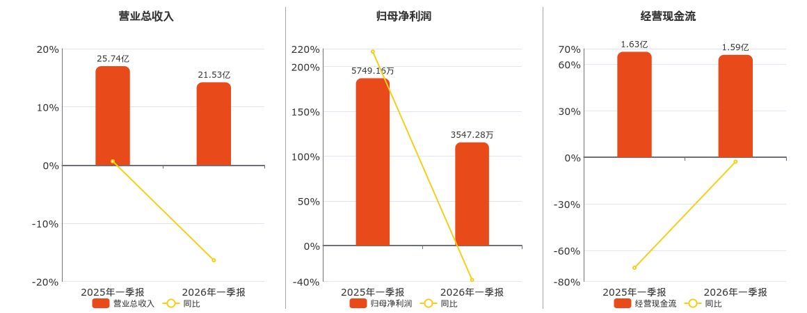 公司营业总收入为21.53亿元,较去年同报告期营业总收入减少4.21亿元,同比较去年同期下降16.36%。归母净利润为3547.28万元,较去年同报告期归母净利润减少2201.88万元,同比较去年同期下降38.30%。经营活动现金净流入为1.59亿元,较去年同报告期经营活动现金净流入减少464.77万元,同比较去年同期下降2.85%。