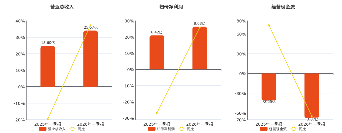 公司营业总收入为25.57亿元。归母净利润为8.08亿元。经营活动现金净流入为-3.87亿元,较去年同报告期经营活动现金净流入减少1.52亿元。