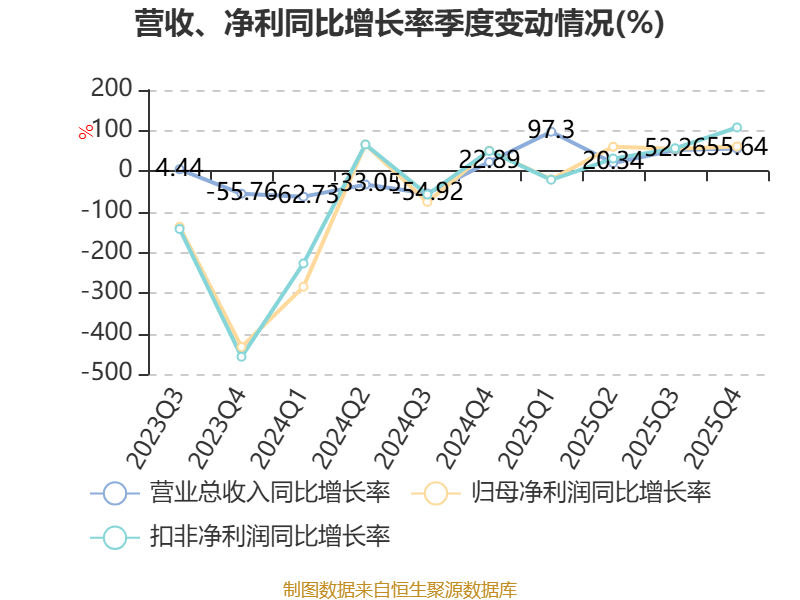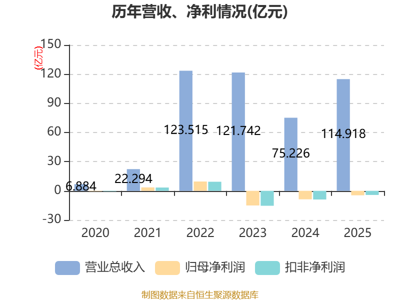 中证智能财讯万润新能(688275)4月25日披露2025年年度报告。2025年,公司实现营业总收入114.92亿元,同比增长52.76%;归母净利润亏损4.58亿元,上年同期亏损8.7亿元;扣非净利润亏损4.24亿元,上年同期亏损8.92亿元;经营活动产生的现金流量净额为5.62亿元,同比下降64.29%;报告期内,万润新能基本每股收益为-3.72元,加权平均净资产收益率为-8.54%。