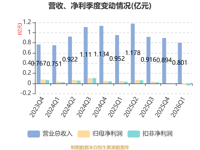 中证智能财讯则成电子(920821)4月24日披露2026年第一季度报告。公司实现营业总收入8010.05万元,同比下降15.86%;归母净利润亏损271.54万元,上年同期盈利464.5万元;扣非净利润亏损388.82万元,上年同期盈利328.55万元;经营活动产生的现金流量净额为3193.83万元,同比增长3498.74%;报告期内,则成电子基本每股收益为-0.0196元,加权平均净资产收益率为-0.52%。