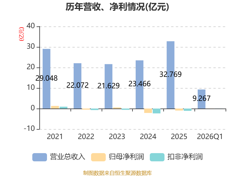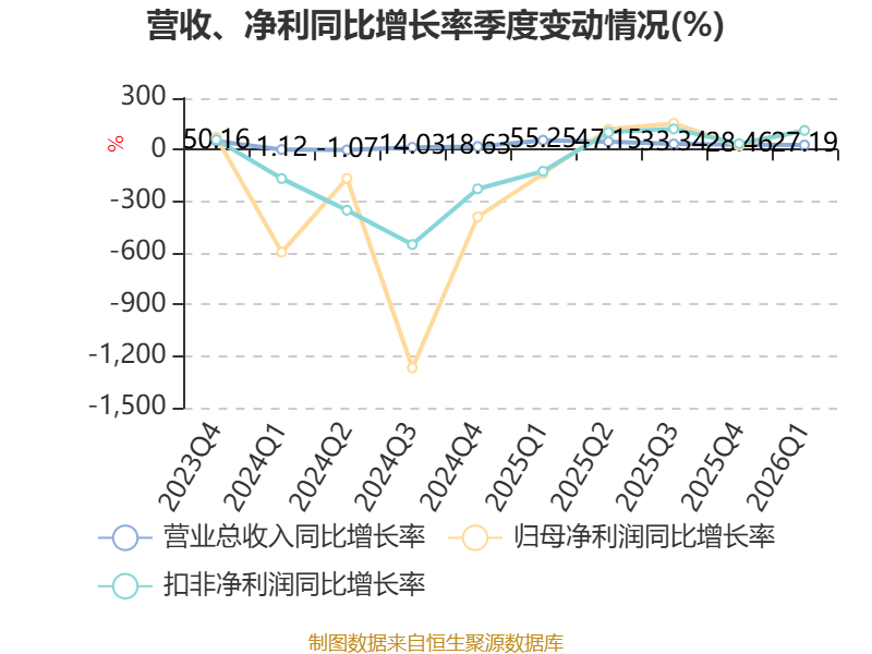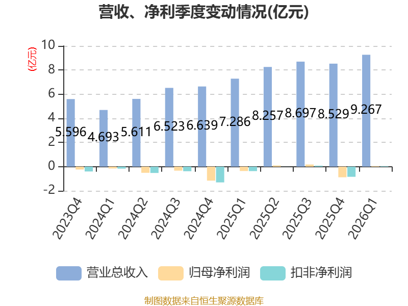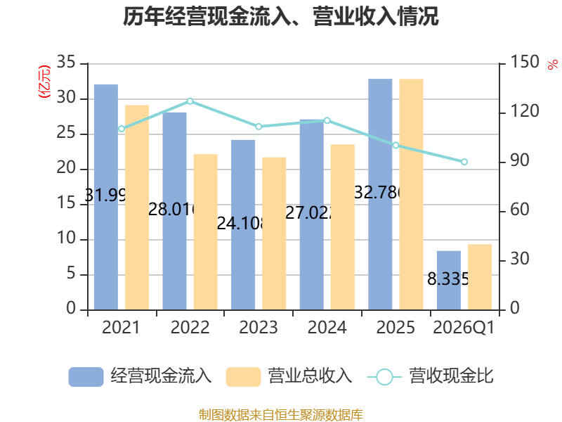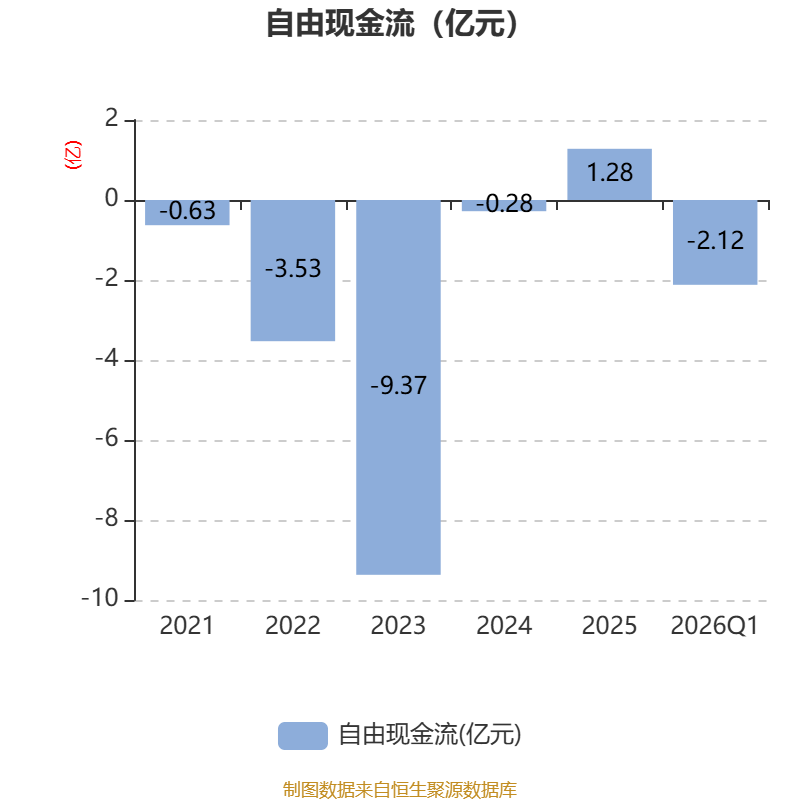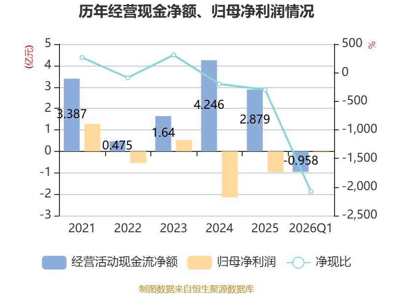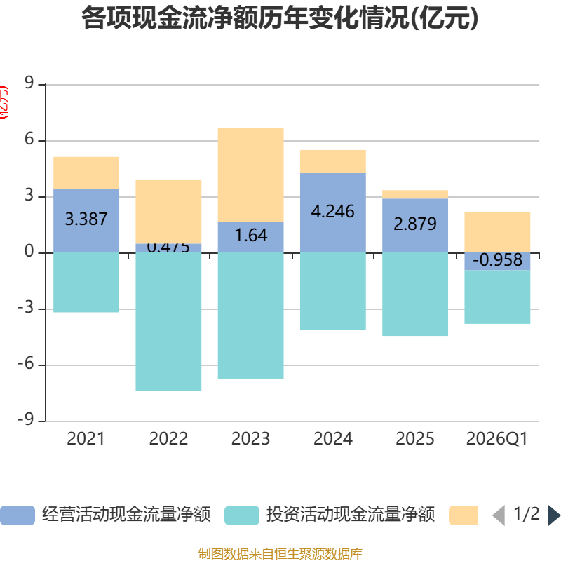 截至2026年一季度末,公司经营活动现金流净额为-9584.05万元,同比减少510.9万元;筹资活动现金流净额2.15亿元,同比增加4352.02万元;投资活动现金流净额-2.86亿元,上年同期为-8486.04万元。
