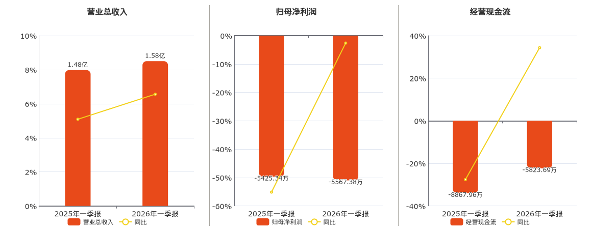 公司营业总收入为1.58亿元,在已披露的同业公司中排名第4,较去年同报告期营业总收入增加969.89万元,实现2年连续上涨,同比较去年同期上涨6.56%。归母净利润为-5567.38万元,在已披露的同业公司中排名第6,较去年同报告期归母净利润减少142.04万元。经营活动现金净流入为-5823.69万元,在已披露的同业公司中排名第6,较去年同报告期经营活动现金净流入增加3044.27万元。