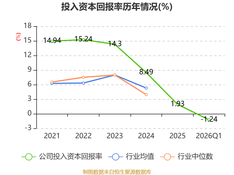 盈利能力方面, 2026年一季度公司加权平均净资产收益率为-1.46%,同比下降0.66个百分点。公司2026年第一季度投入资本回报率为-1.24%,较上年同期下降0.36个百分点。