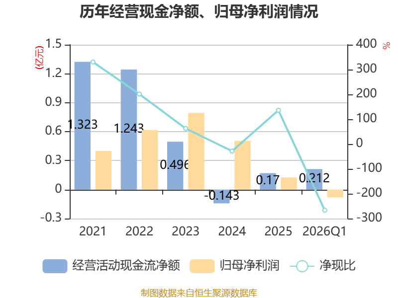 截至2026年一季度末,公司经营活动现金流净额为2120.45万元,同比下降58.58%;筹资活动现金流净额0元,与同期相比基本不变;投资活动现金流净额-4401.37万元,上年同期为679.47万元。