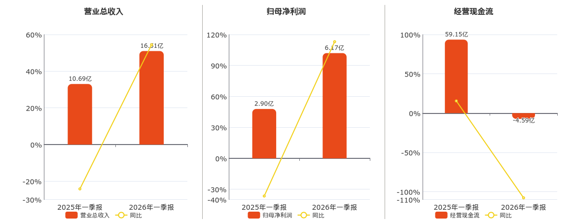 公司营业总收入为16.51亿元,较去年同报告期营业总收入增加5.82亿元,同比较去年同期上涨54.41%。归母净利润为6.17亿元,较去年同报告期归母净利润增加3.27亿元,同比较去年同期上涨113.03%。经营活动现金净流入为-4.59亿元。