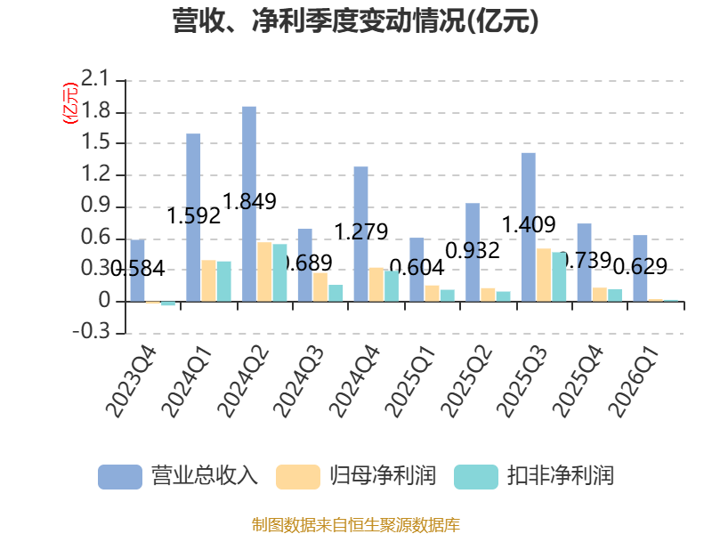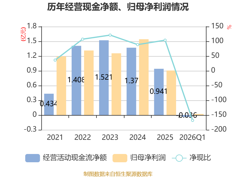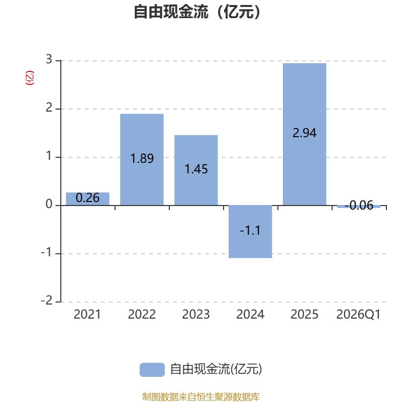 截至2026年一季度末,公司经营活动现金流净额为-364.04万元,同比增加2722.7万元;筹资活动现金流净额0元,同比增加89.47万元;投资活动现金流净额-2957.31万元,上年同期为992.42万元。