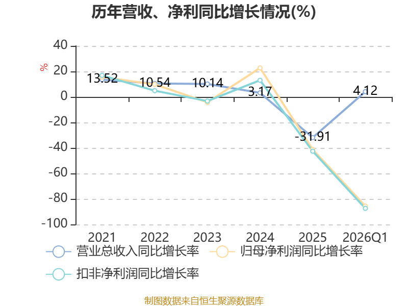 资产重大变化方面,截至2026年一季度末,公司固定资产较上年末增加265.68%,占公司总资产比重上升6.19个百分点;在建工程合计较上年末减少82.48%,占公司总资产比重下降5.75个百分点;应收票据及应收账款较上年末减少13.2%,占公司总资产比重下降1.69个百分点;存货较上年末增加16.11%,占公司总资产比重上升0.93个百分点。