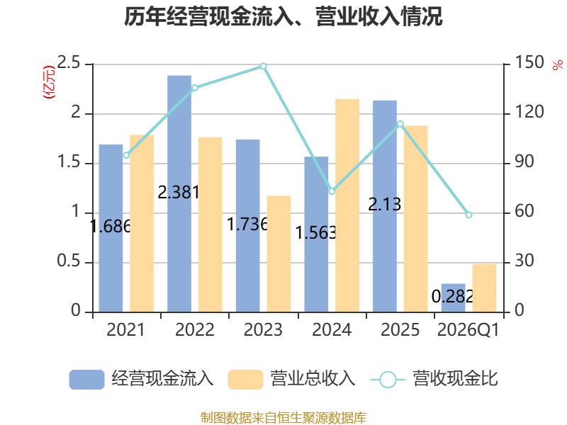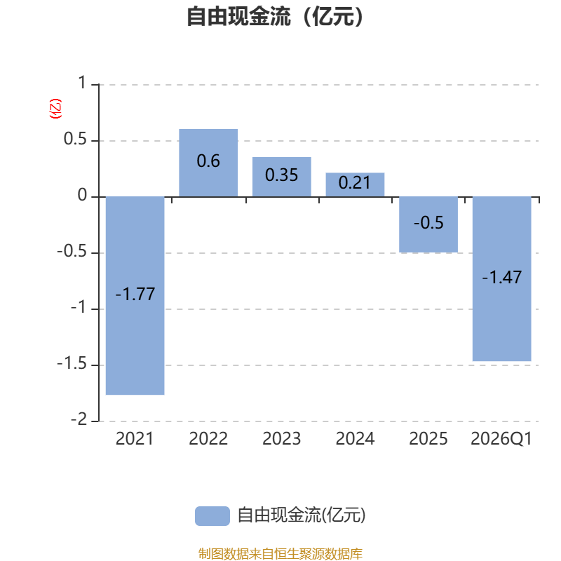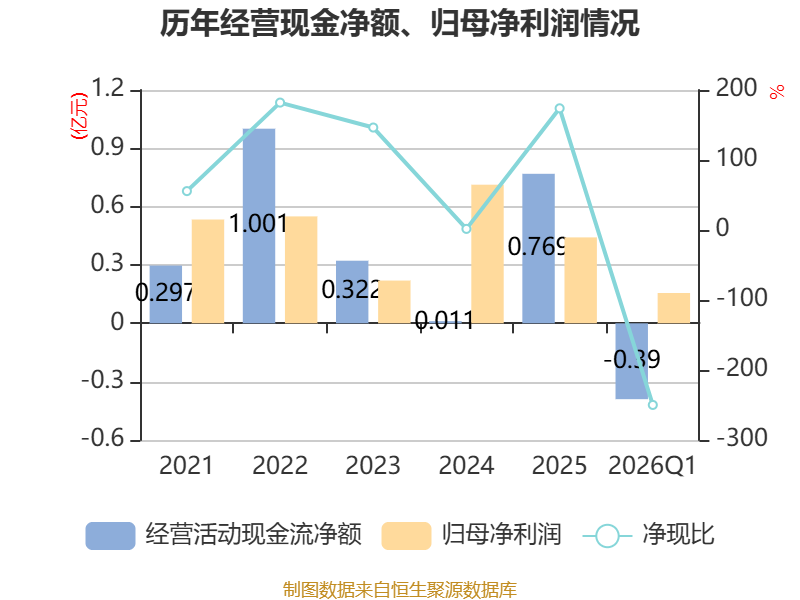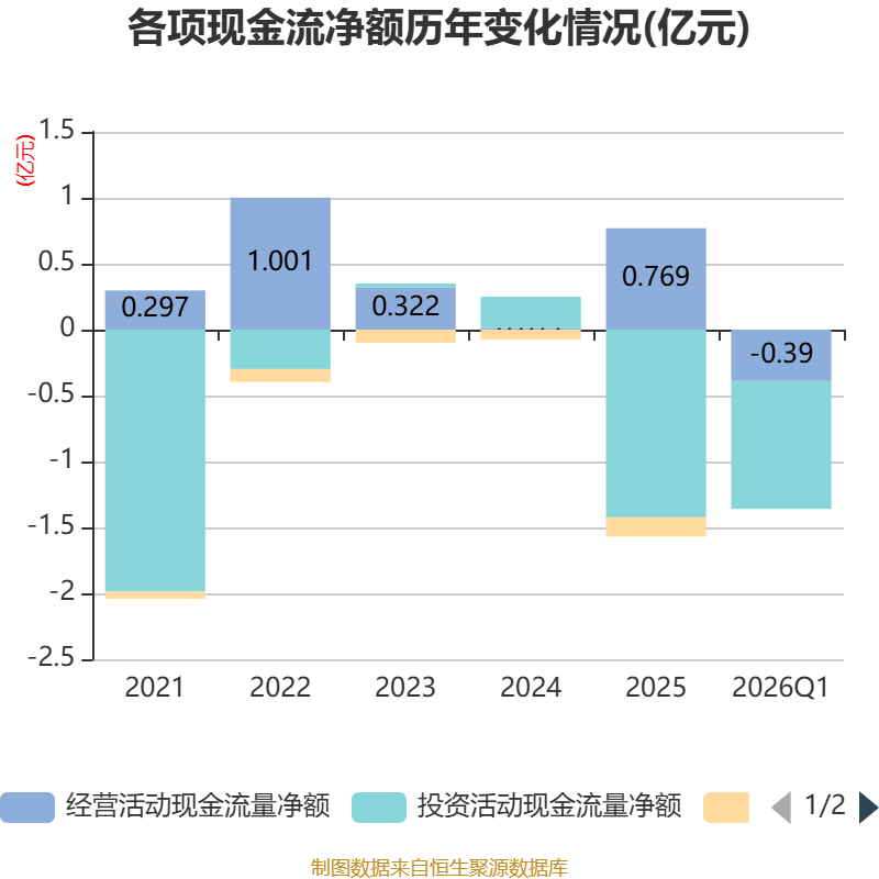 截至2026年一季度末,公司经营活动现金流净额为-3895.82万元,同比减少4134.94万元;筹资活动现金流净额0元,与同期相比基本不变;投资活动现金流净额-9702.38万元,上年同期为-1.77亿元。