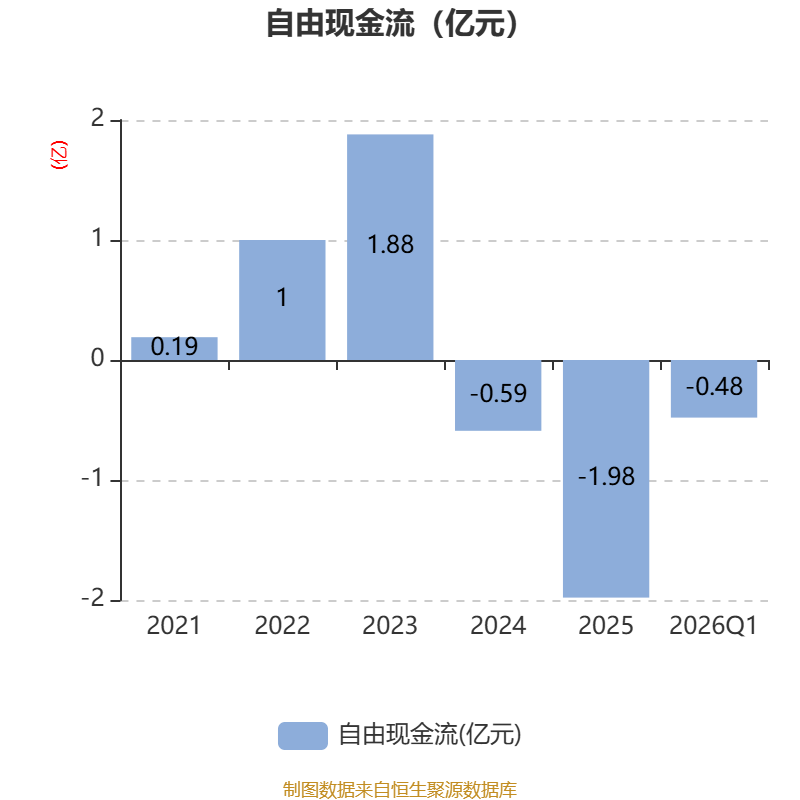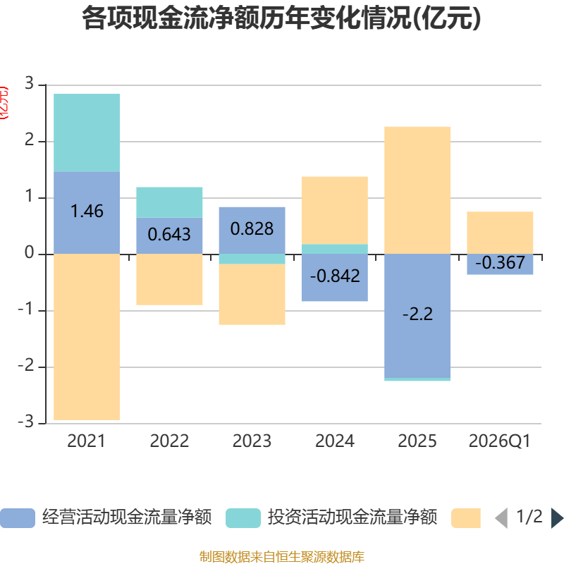 截至2026年一季度末,公司经营活动现金流净额为-3671.25万元,同比减少5653.78万元;筹资活动现金流净额7470.61万元,同比增加8724.92万元;投资活动现金流净额-49.16万元,上年同期为-104.28万元。