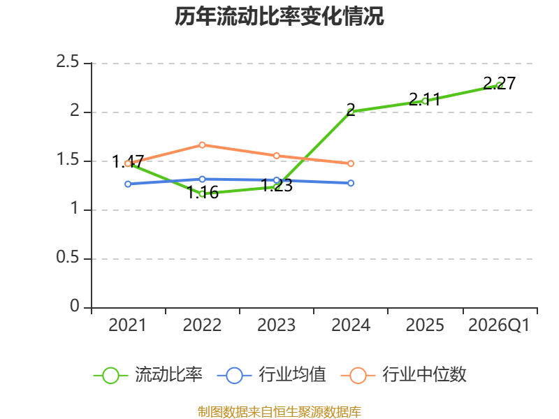 2026年第一季度,公司流动比率为2.27,速动比率为1.34。