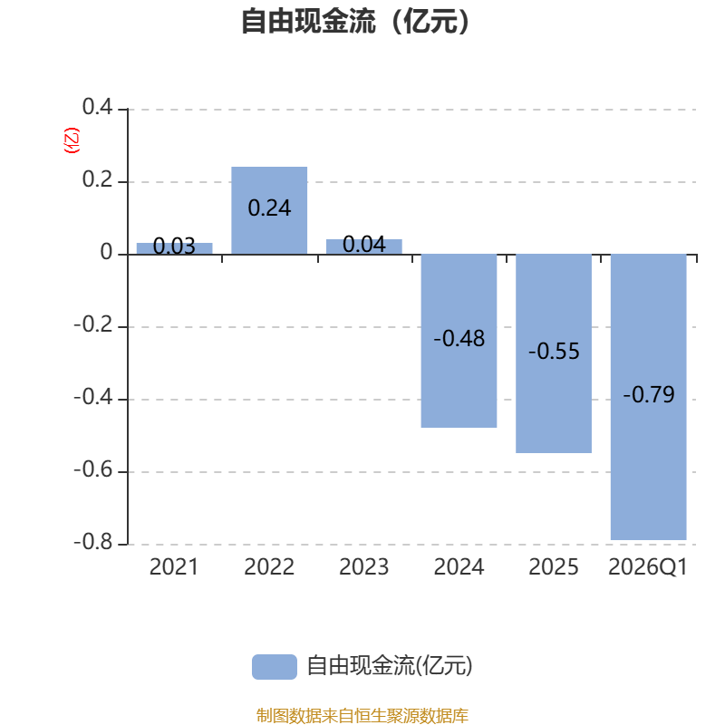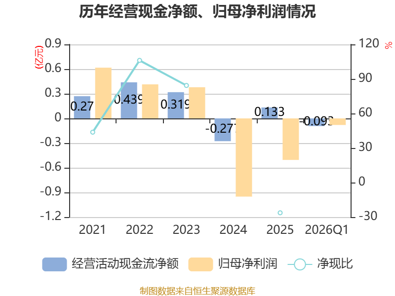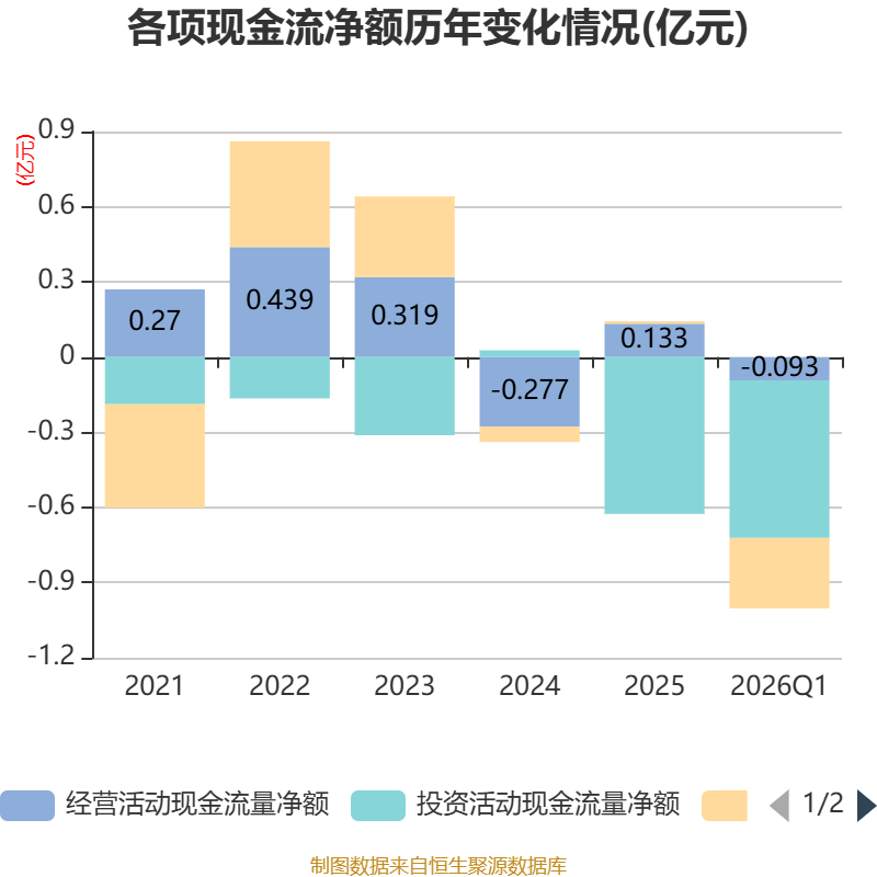 截至2026年一季度末,公司经营活动现金流净额为-929.66万元,同比减少291.4万元;筹资活动现金流净额-2811.82万元,同比减少4232.16万元;投资活动现金流净额-6288.88万元,上年同期为1997.84万元。