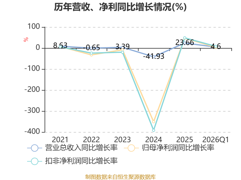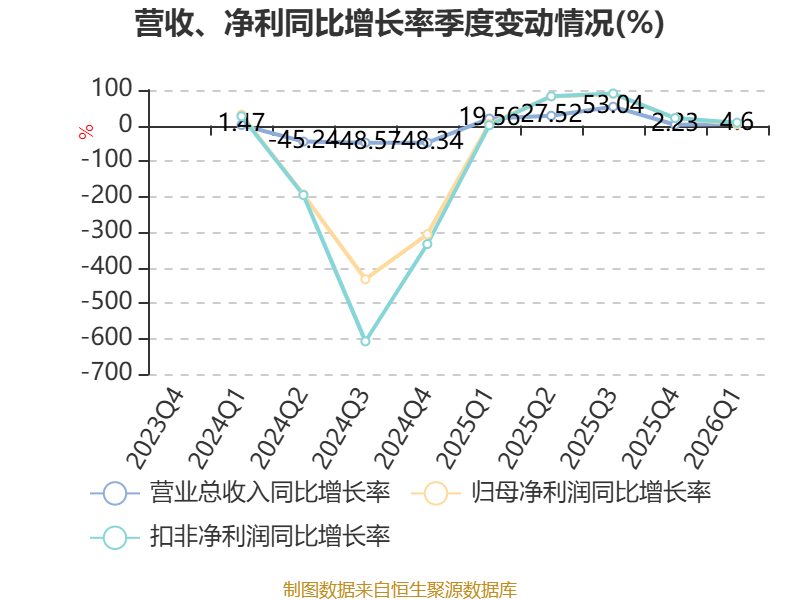 资产重大变化方面,截至2026年一季度末,公司货币资金较上年末减少53.92%,占公司总资产比重下降14.6个百分点;交易性金融资产合计较上年末增加107.79%,占公司总资产比重上升9.84个百分点;存货较上年末增加4.53%,占公司总资产比重上升2.46个百分点;在建工程合计较上年末增加1054.81%,占公司总资产比重上升1.03个百分点。