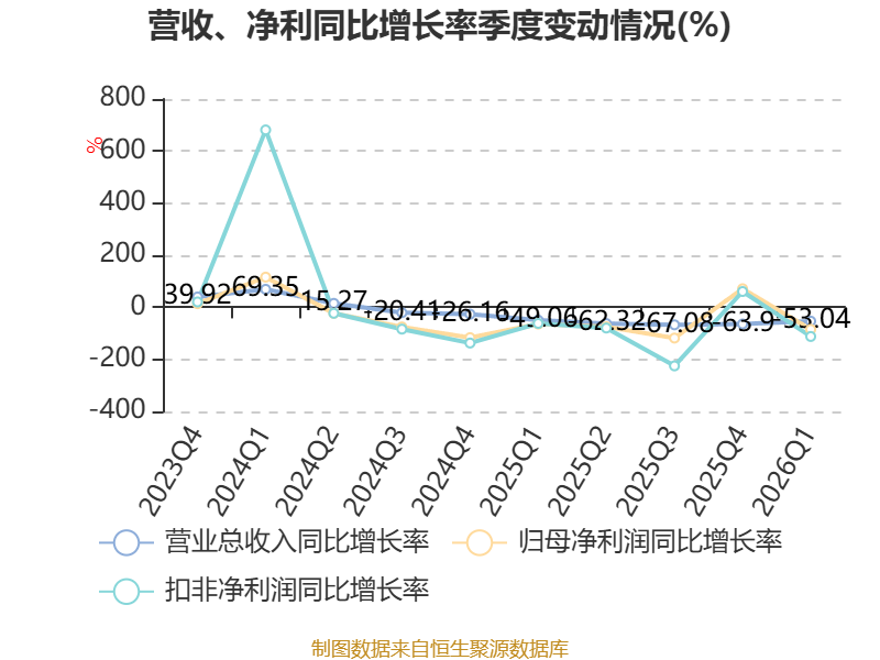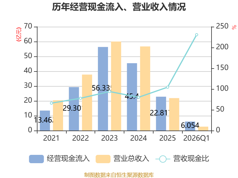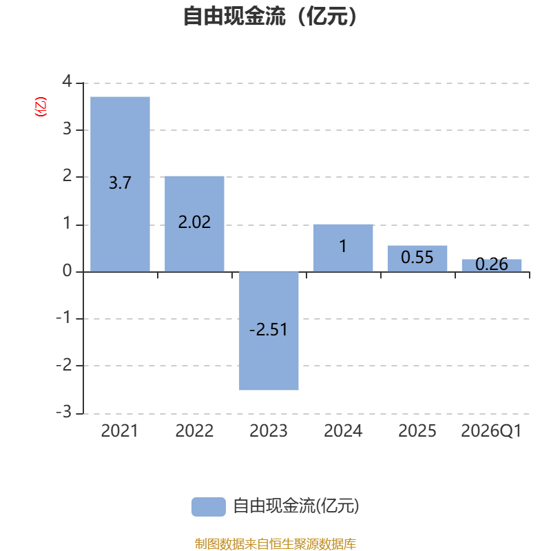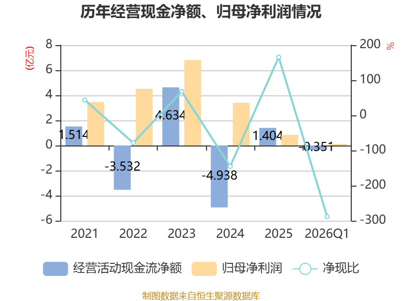 截至2026年一季度末,公司经营活动现金流净额为-3513.61万元,同比减少2.51亿元;筹资活动现金流净额1.58亿元,同比减少621.55万元;投资活动现金流净额1289.57万元,上年同期为-3.01亿元。