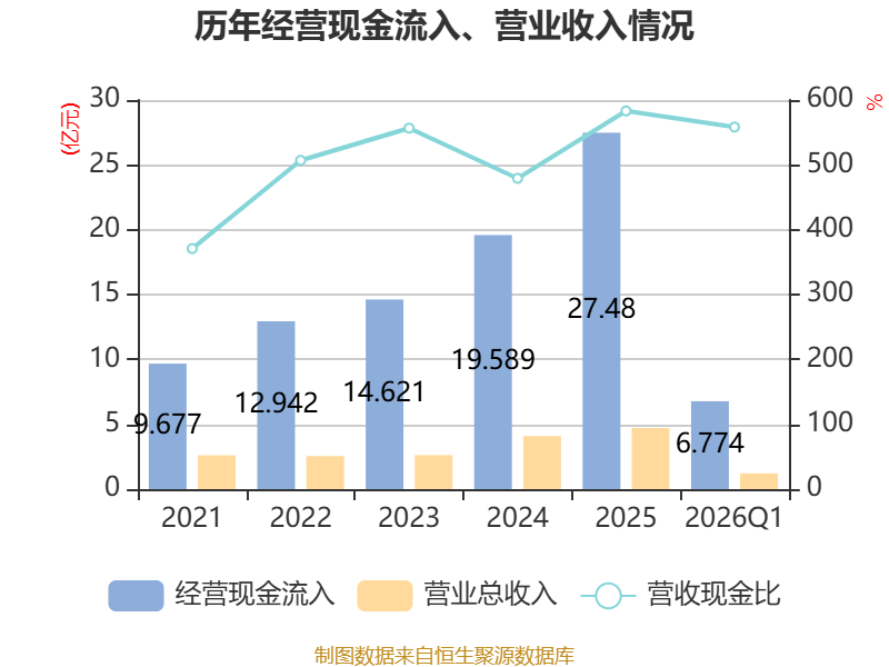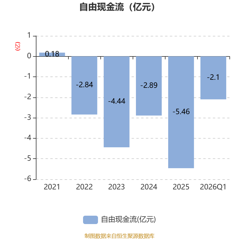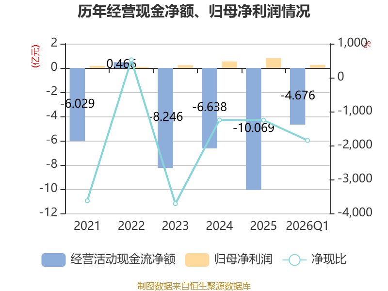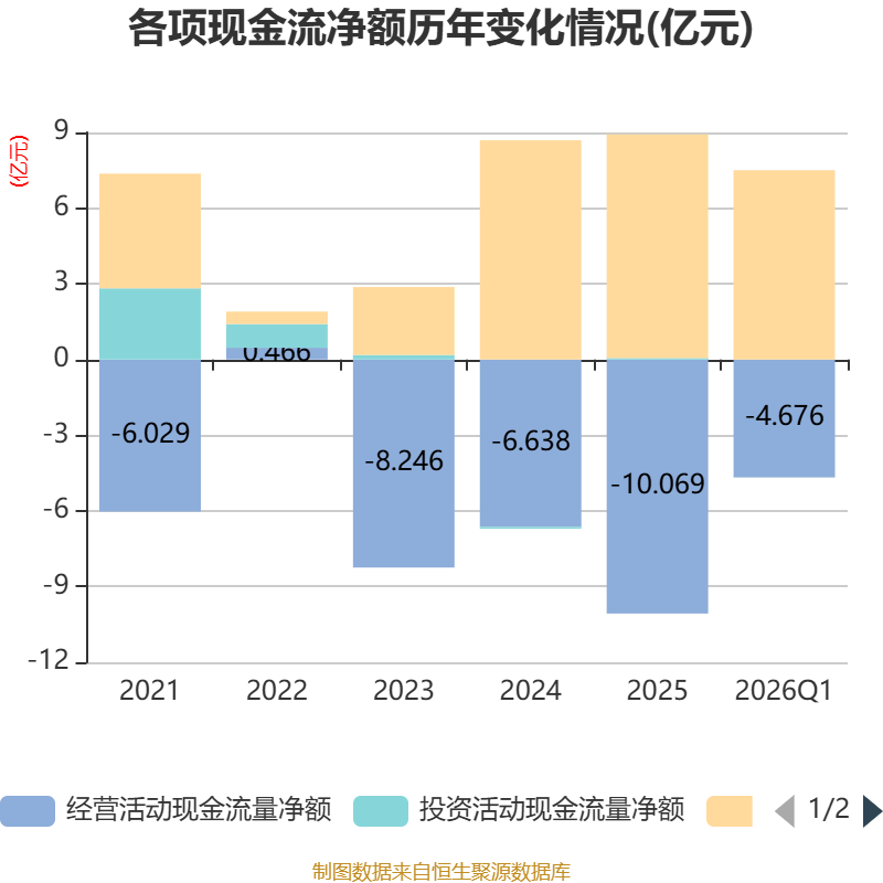 截至2026年一季度末,公司经营活动现金流净额为-4.68亿元,同比减少2.47亿元;筹资活动现金流净额7.5亿元,同比增加1.87亿元;投资活动现金流净额-24.9万元,上年同期为380.24万元。