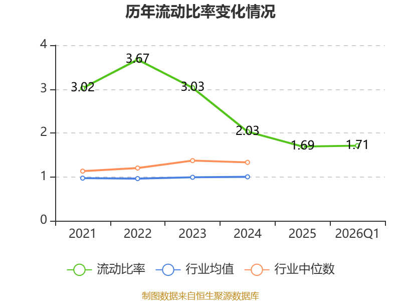 2026年第一季度,公司流动比率为1.71,速动比率为1.69。