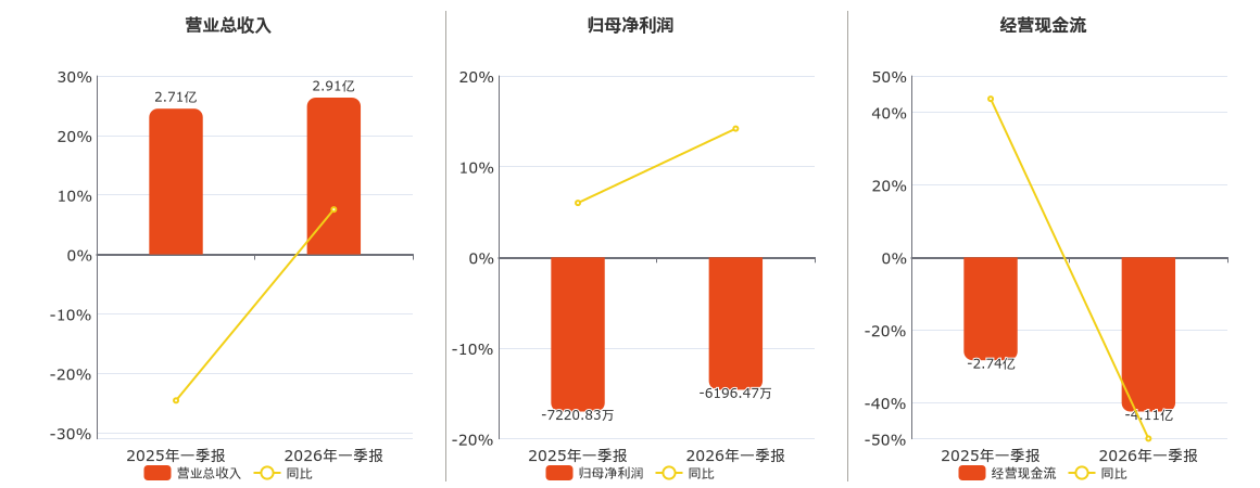 公司营业总收入为2.91亿元,较去年同报告期营业总收入增加2043.78万元,同比较去年同期上涨7.55%。归母净利润为-6196.47万元,较去年同报告期归母净利润增加1024.37万元,实现2年连续上涨。经营活动现金净流入为-4.11亿元。