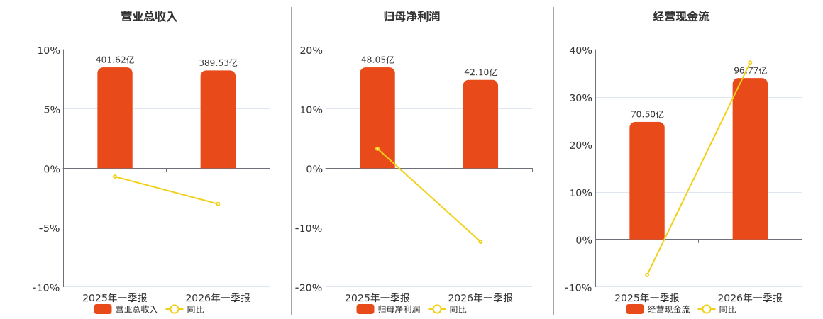 公司营业总收入为389.53亿元,较去年同报告期营业总收入减少12.09亿元,同比较去年同期下降3.01%。归母净利润为42.10亿元,较去年同报告期归母净利润减少5.95亿元,同比较去年同期下降12.38%。经营活动现金净流入为96.77亿元,较去年同报告期经营活动现金净流入增加26.27亿元,同比较去年同期上涨37.27%。