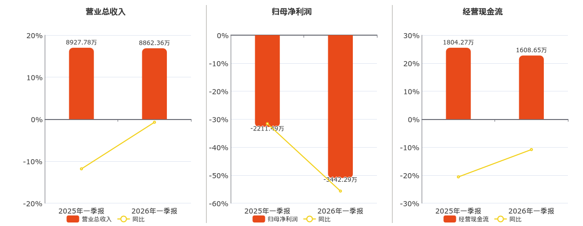 公司营业总收入为8862.36万元,较去年同报告期营业总收入减少65.42万元,同比较去年同期下降0.73%。归母净利润为-3442.29万元,较去年同报告期归母净利润减少1230.81万元。经营活动现金净流入为1608.65万元,较去年同报告期经营活动现金净流入减少195.62万元,同比较去年同期下降10.84%。