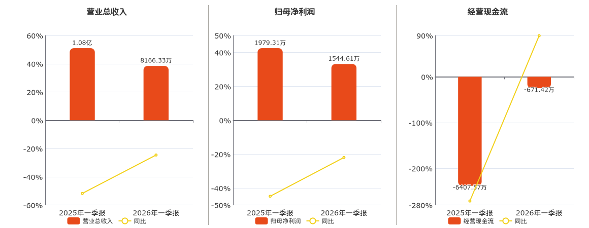公司营业总收入为8166.33万元,较去年同报告期营业总收入减少2666.95万元,同比较去年同期下降24.62%。归母净利润为1544.61万元,较去年同报告期归母净利润减少434.69万元,同比较去年同期下降21.96%。经营活动现金净流入为-671.42万元,较去年同报告期经营活动现金净流入增加5736.15万元。