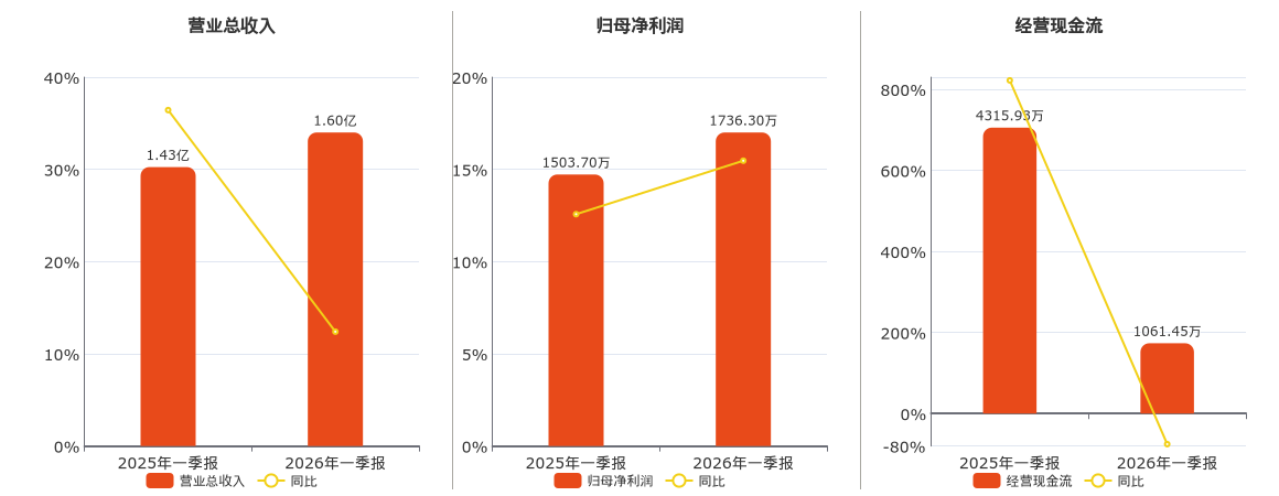 公司营业总收入为1.60亿元。归母净利润为1736.30万元。经营活动现金净流入为1061.45万元,较去年同报告期经营活动现金净流入减少3254.48万元,同比较去年同期下降75.41%。