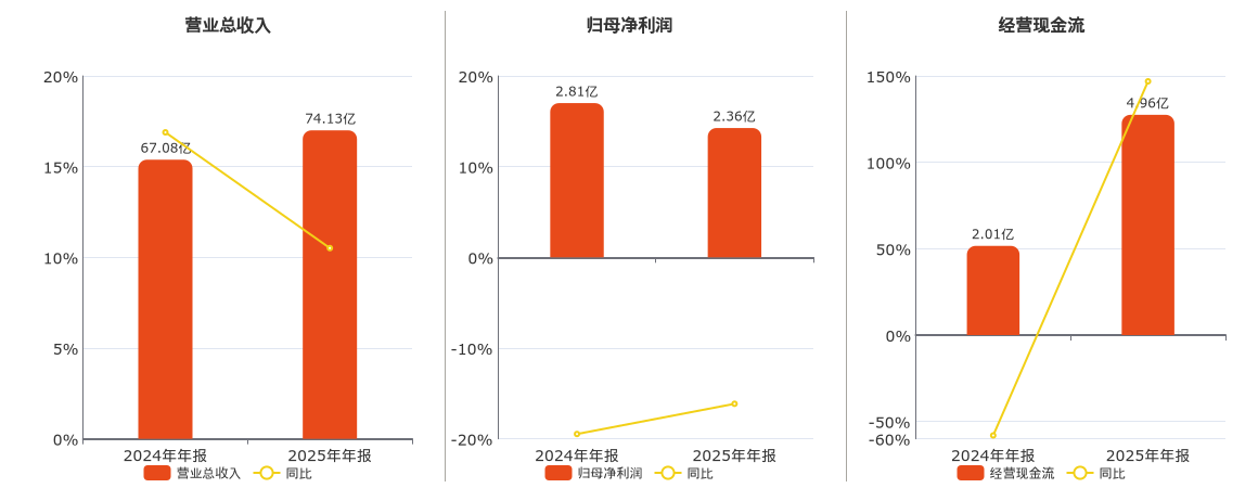 公司营业总收入为74.13亿元,在已披露的同业公司中排名第23,较去年同报告期营业总收入增加7.05亿元,实现3年连续上涨,同比较去年同期上涨10.51%。归母净利润为2.36亿元,在已披露的同业公司中排名第54,较去年同报告期归母净利润减少4533.58万元,同比较去年同期下降16.14%。经营活动现金净流入为4.96亿元,在已披露的同业公司中排名第47,较去年同报告期经营活动现金净流入增加2.95亿元,同比较去年同期上涨146.86%。