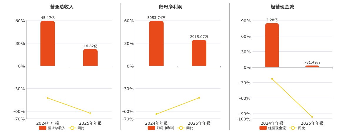 公司营业总收入为16.82亿元,在已披露的同业公司中排名第9,较去年同报告期营业总收入减少8.73亿元,同比较去年同期下降34.17%。归母净利润为2915.07万元,在已披露的同业公司中排名第4,较去年同报告期归母净利润减少2138.67万元,同比较去年同期下降42.32%。经营活动现金净流入为781.49万元,在已披露的同业公司中排名第9,较去年同报告期经营活动现金净流入减少2.20亿元,同比较去年同期下降96.57%。
