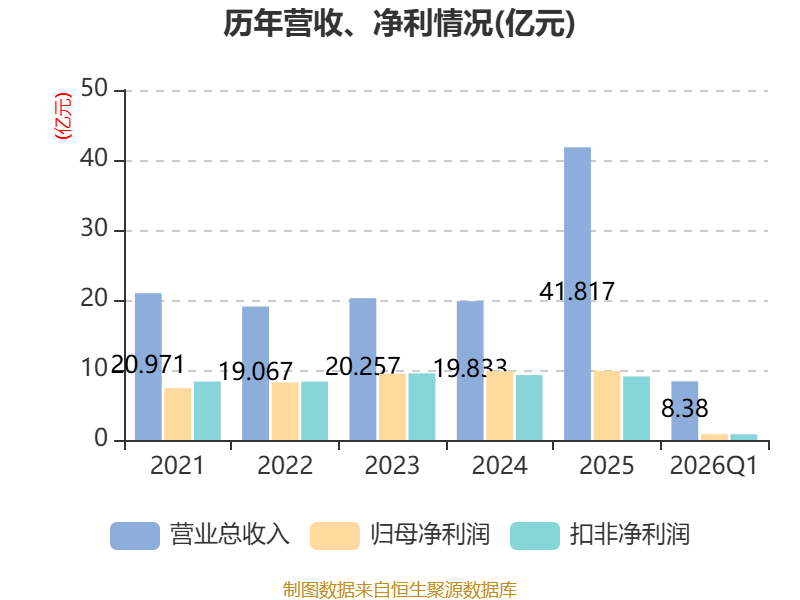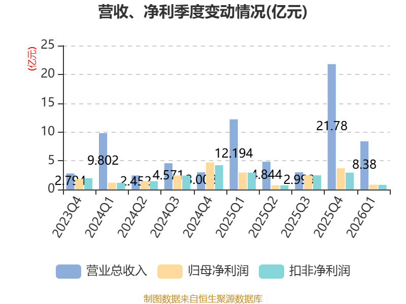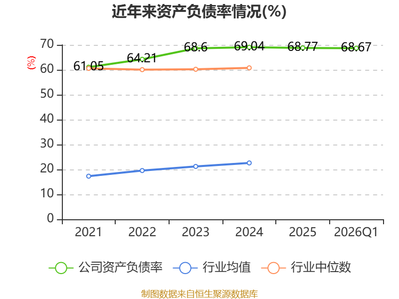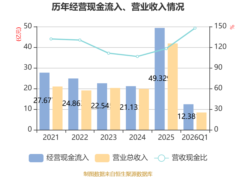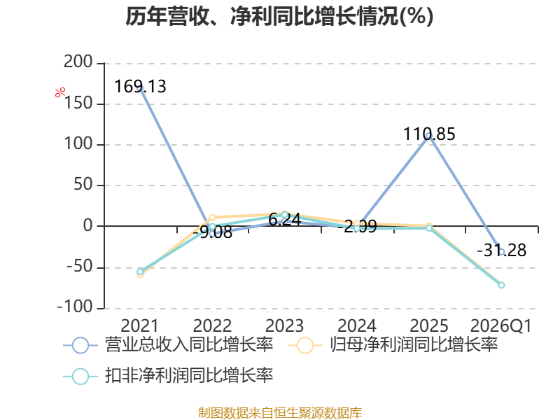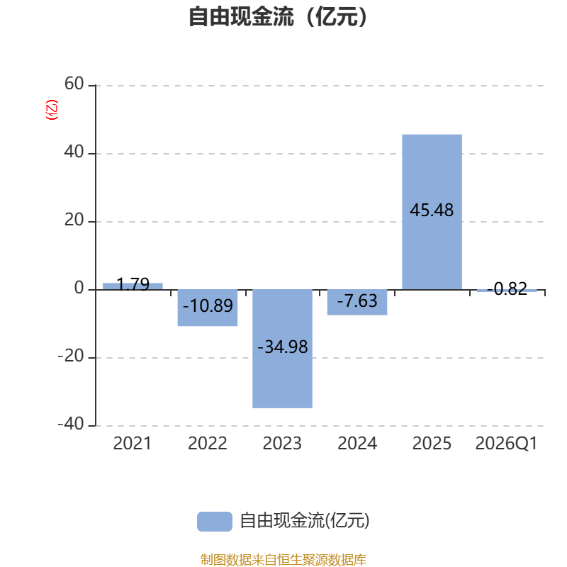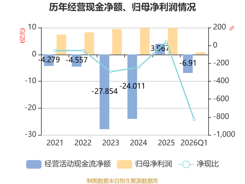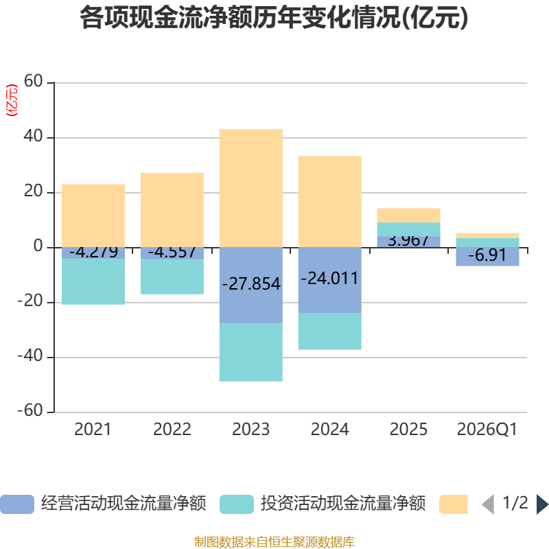 截至2026年一季度末,公司经营活动现金流净额为-6.91亿元,同比增加1.05亿元;筹资活动现金流净额1.71亿元,同比减少9.3亿元;投资活动现金流净额3.33亿元,上年同期为2.22亿元。