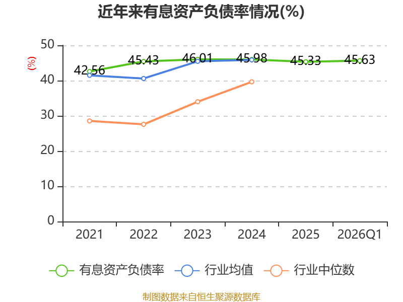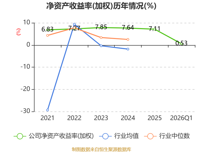 盈利能力方面, 2026年一季度公司加权平均净资产收益率为0.53%,同比下降1.62个百分点。公司2026年第一季度投入资本回报率为0.22%,较上年同期下降0.59个百分点。