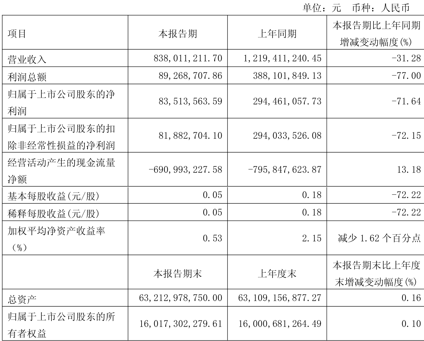 中证智能财讯张江高科(600895)4月25日披露2026年第一季度报告。公司实现营业总收入8.38亿元,同比下降31.28%;归母净利润8351.36万元,同比下降71.64%;扣非净利润8188.27万元,同比下降72.15%;经营活动产生的现金流量净额为-6.91亿元,上年同期为-7.96亿元;报告期内,张江高科基本每股收益为0.05元,加权平均净资产收益率为0.53%。