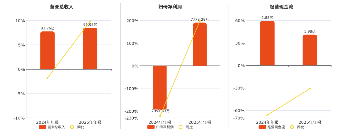 公司营业总收入为91.98亿元,在已披露的同业公司中排名第12,较去年同报告期营业总收入增加8.22亿元,同比较去年同期上涨9.81%。归母净利润为7778.28万元,在已披露的同业公司中排名第30,较去年同报告期归母净利润增加1.58亿元。经营活动现金净流入为1.98亿元,在已披露的同业公司中排名第23。