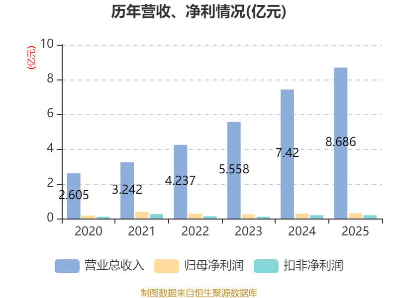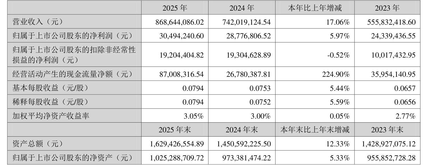 中证智能财讯博济医药(300404)4月25日披露2025年年度报告。2025年,公司实现营业总收入8.69亿元,同比增长17.06%;归母净利润3049.42万元,同比增长5.97%;扣非净利润1920.44万元,同比下降0.52%;经营活动产生的现金流量净额为8700.83万元,同比增长224.90%;报告期内,博济医药基本每股收益为0.0794元,加权平均净资产收益率为3.05%。公司2025年度分配预案为:拟向全体股东每10股派现0.13元(含税)。