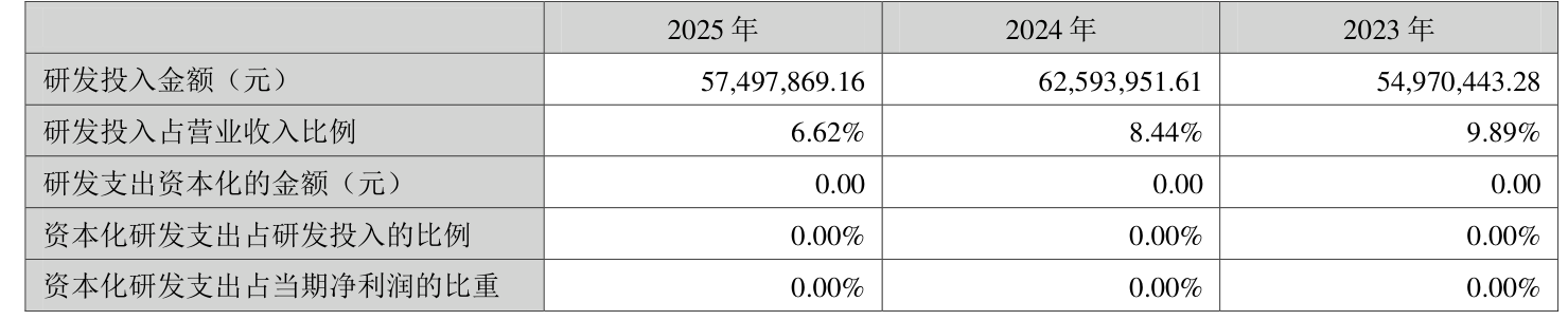 2025年全年,公司研发投入金额为5749.79万元,同比下降8.14%;研发投入占营业收入比例为6.62%,相比上年同期下降1.82个百分点。此外,公司全年研发投入资本化率为0%。