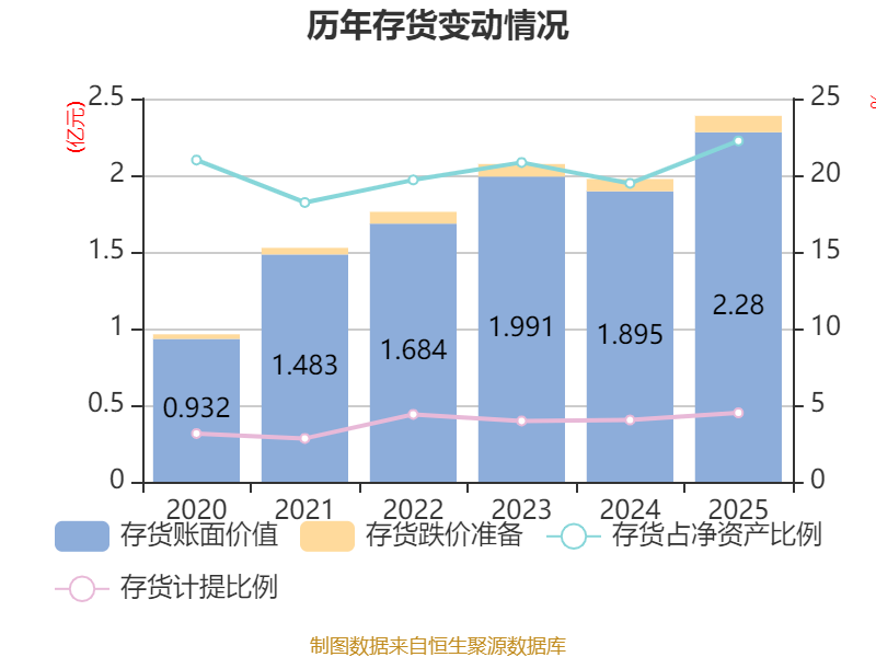 从存货变动来看,截至2025年末,公司存货账面价值为2.28亿元,占净资产的22.24%,较上年末增加3855.21万元。其中,存货跌价准备为1073.48万元,计提比例为4.5%。