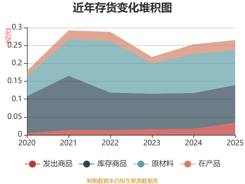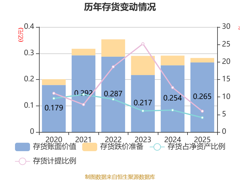 从存货变动来看,截至2025年末,公司存货账面价值为2649.43万元,占净资产的4.11%,较上年末增加107.75万元。其中,存货跌价准备为167.48万元,计提比例为5.95%。
