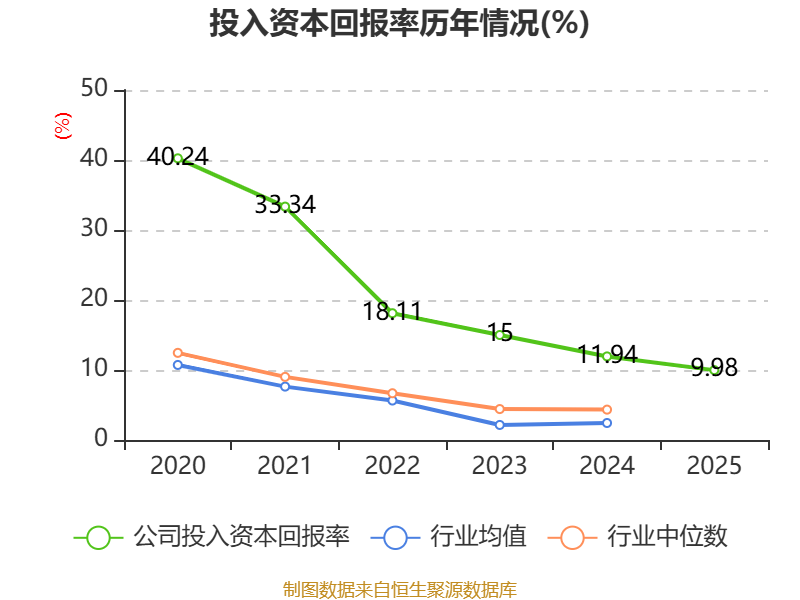 数据显示,2025年公司加权平均净资产收益率为11.32%,较上年同期下降4.25个百分点。公司2025年投入资本回报率为9.98%,较上年同期下降1.96个百分点。