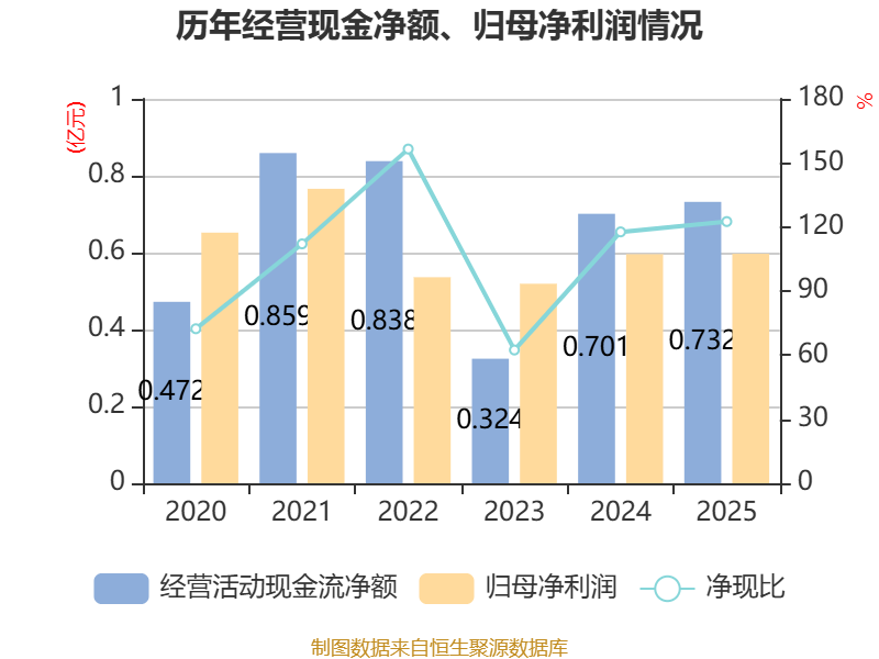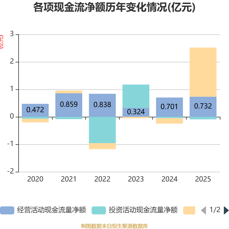 截至2025年,公司经营活动现金流净额为7321.73万元,同比增长4.46%;筹资活动现金流净额1.79亿元,同比增加1.99亿元;投资活动现金流净额-927.27万元,上年同期为-484.39万元。
