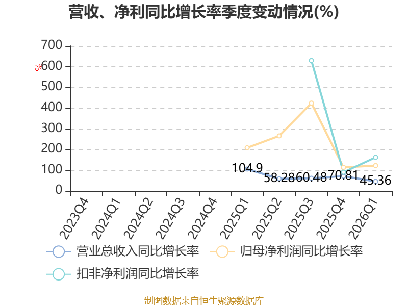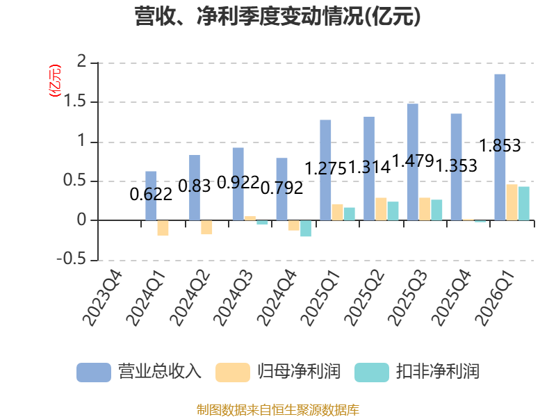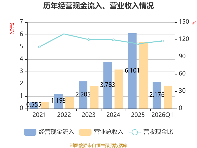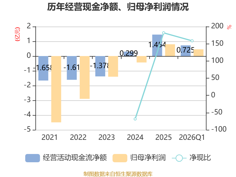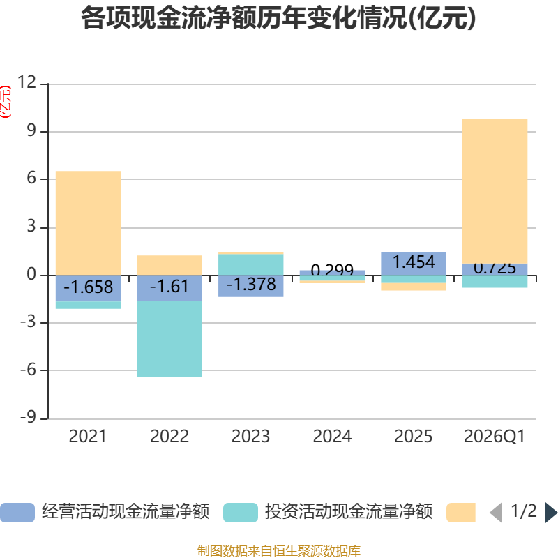 截至2026年一季度末,公司经营活动现金流净额为7247.28万元,同比增长94.18%;筹资活动现金流净额9.07亿元,同比增加9.3亿元;投资活动现金流净额-7975.22万元,上年同期为1266.96万元。