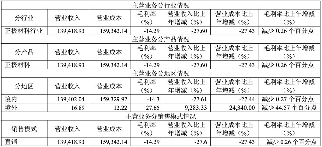 同日,振华新材发布的年报显示,2025年,受市场需求结构性转变、三元材料整体需求增长受限及公司6系高电压材料等新产品尚未形成批量订单,导致产品销量连续下滑,产能利用率处于低位,单位产品的折旧、人工等固定成本及停工损失同比增加。2025年公司实现营业收入142,846.82万元,同比下降27.16%;归属于上市公司股东的净利润-43,238.51万元,同比增加9,532.12万元,减亏幅度达18.06%;归属于上市公司股东的扣除非经常性损益的净利润-44,515.91万元,同比增加8,932.81万元,减亏幅度达16.71%。至此,公司已连续两年归母净利润为负。