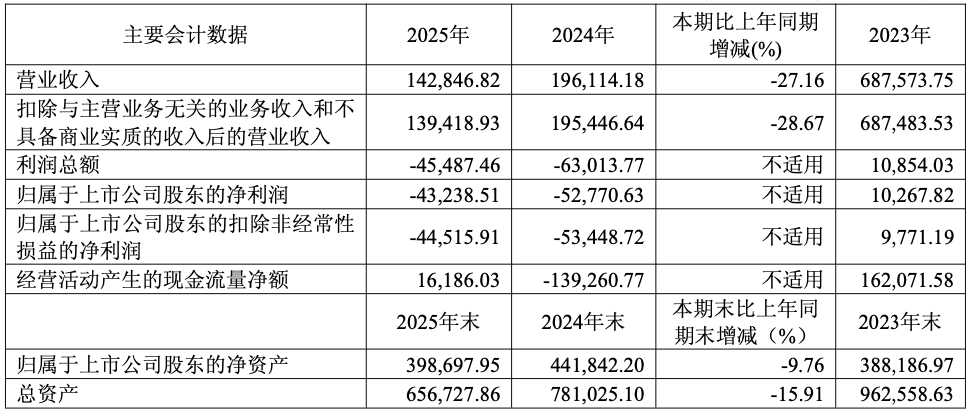公司2025年度实现营业收入142,846.82万元,其中主营业务收入139,418.93万元,占营业收入比例为97.60%,较上年同比减少27.60%,毛利率同比减少0.26个百分点至-14.29%。