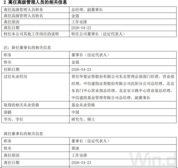 中信建投基金表示,自4月23日起,由金强代为履行公司总经理职务,期限不超过6个月。为便于公司经营管理活动的正常运行,在相关监管程序以及工商变更手续完成前,由原法定代表人黄凌履行公司法定代表人职责。