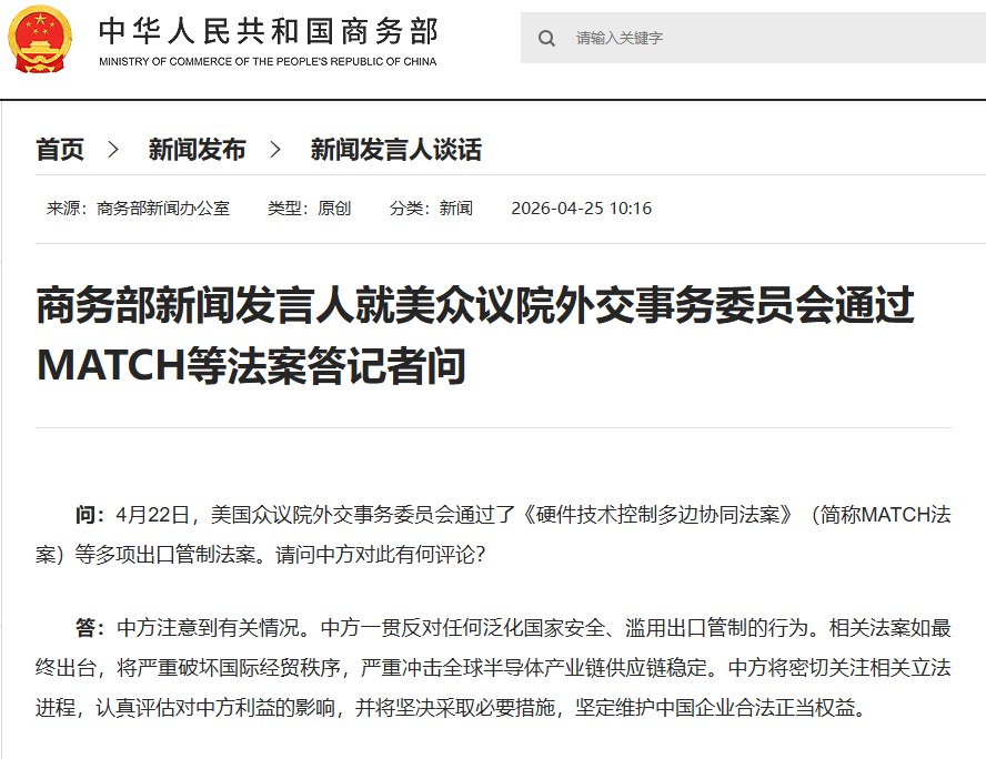 商务部新闻发言人就美众议院外交事务委员会通过MATCH等法案答记者问