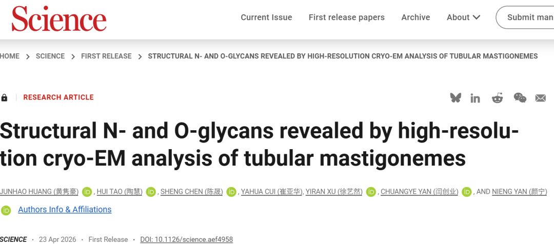 深圳医学科学院颜宁团队联合清华大学团队,在《科学》发表糖质结构研究重磅成果。团队搭建高分辨率冷冻电镜、糖蛋白质组学与AI建模融合研究体系,获得约2整体分辨率、核心局部1.8的超高分辨率三维电镜密度图,将天然糖质复合物研究推进至近原子分辨率层面。