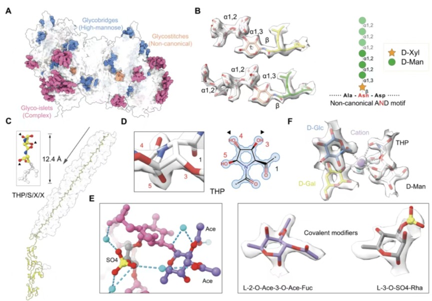 糖质是生命四大基本生物大分子之一,在细胞识别、信号转导、免疫调控和结构支持等多种生理过程中发挥关键作用。此次研究结果的分辨率水平使对天然糖质的直接可视化成为可能,不仅支持多种单糖类型的精确识别,也为乙酰化、甲基化和硫酸化等多种共价修饰的判定提供了明确的结构依据。在此基础上,研究者还通过整合结构生物学研究与靶向质谱技术,发现了一类基于“AND”基序的新型非经典N-糖基化类型,并借助结构聚类搜索揭示了该基序在多种高致病性物种中的进化保守性。与此同时,由颜宁实验室开发的AI自动建模工具EModelG显著提升了糖质结构自动建模的效率,推动糖质结构解析从依赖间接片段信息推断向高精度直接建模转变,也为复杂天然糖质的大规模结构研究提供了方法学支撑。